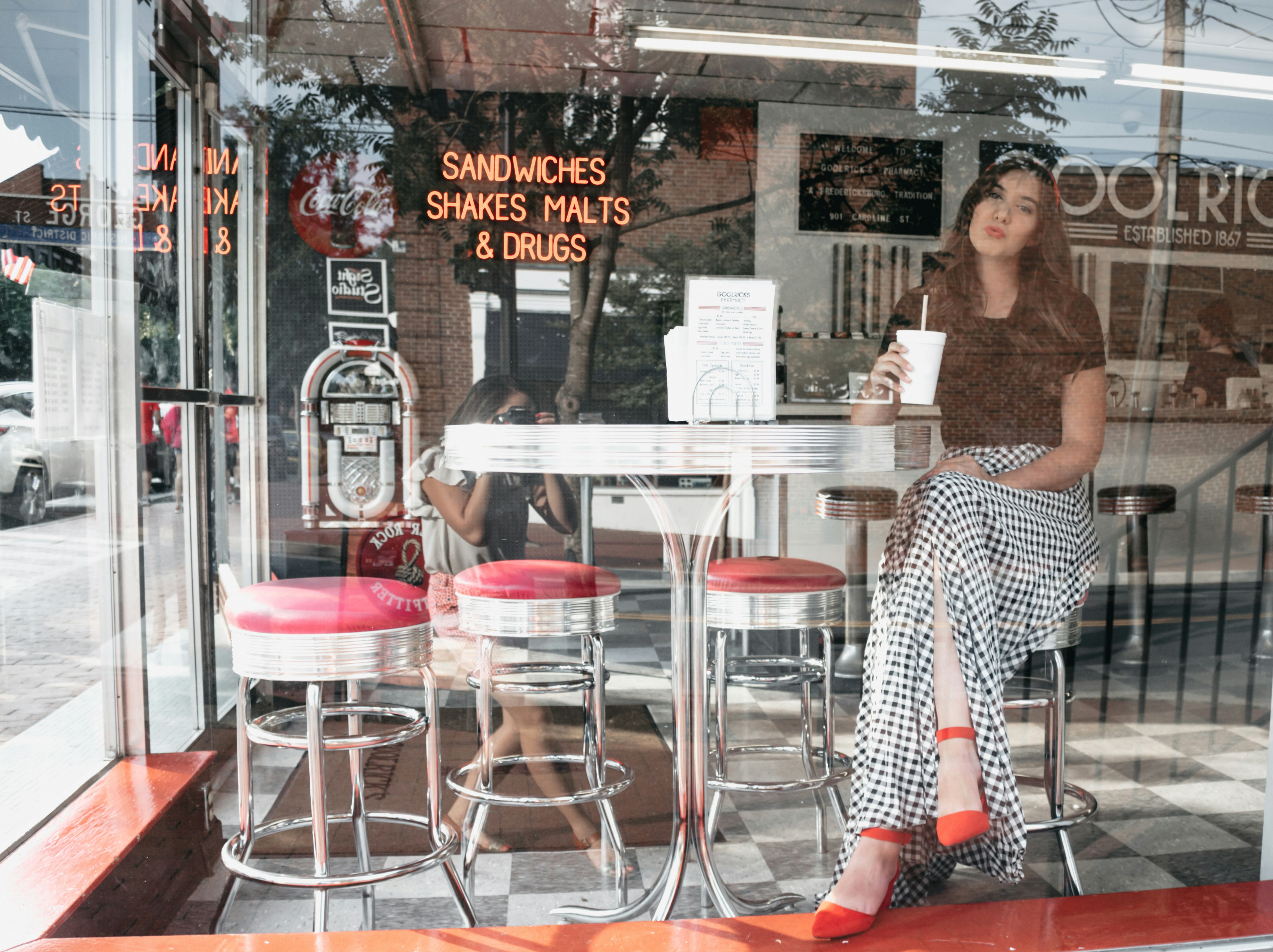 Woman Sitting On Bar Stool Inside Sandwiches Shakes Malts And
