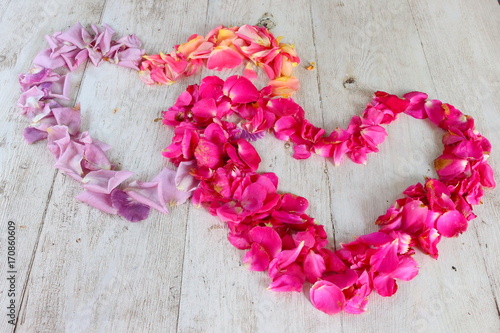 Rose Petal Heart Laid Out On A White Wooden Table Decoration Day