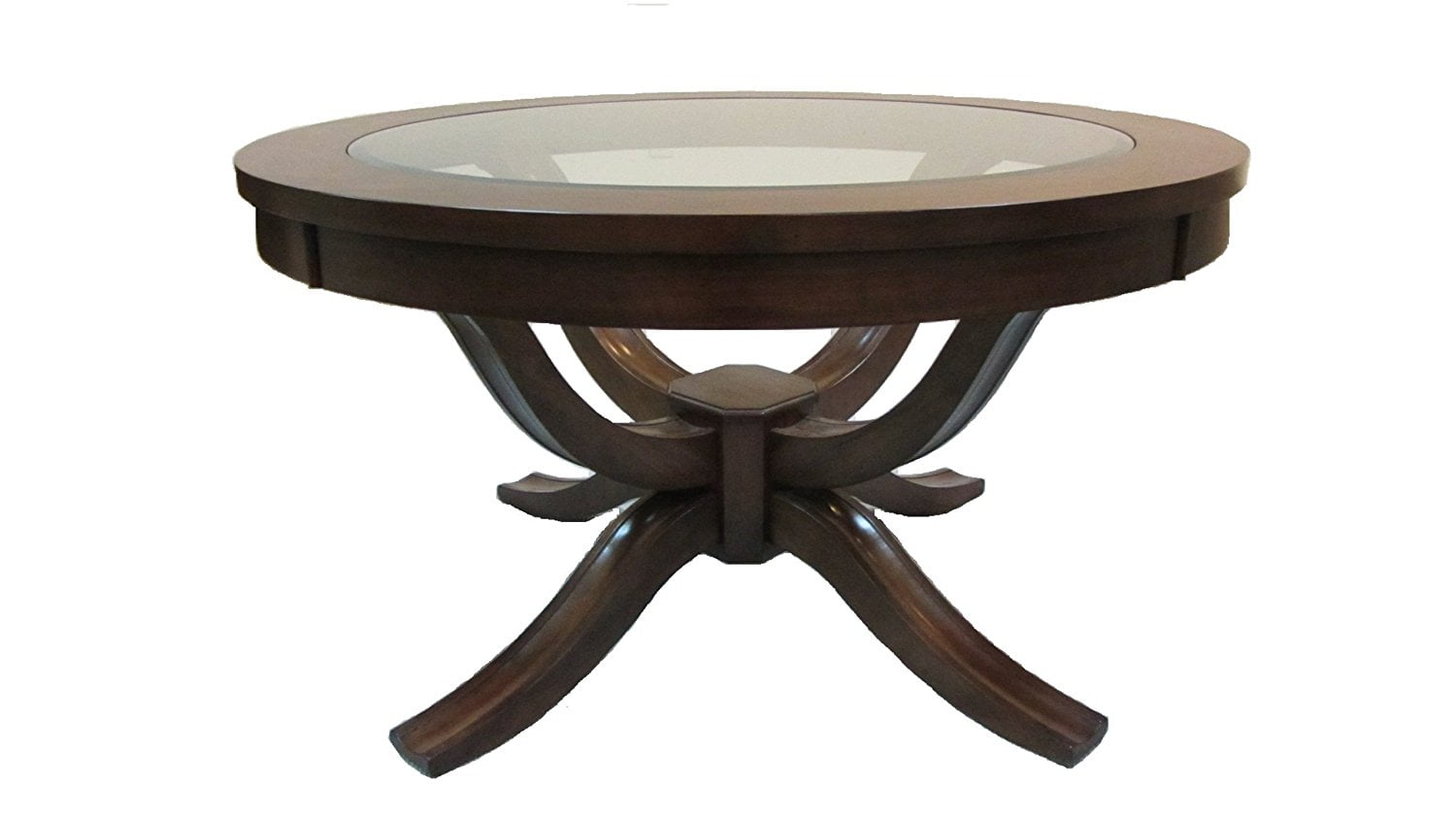 The solid wood frame is beautifully bathed in a cappuccino finish and supports a clear beveled float glass insert table tops. This modern coffee table is finished in mahogany. Decorate your living room or office with this beautiful glass contemporary coffee table.