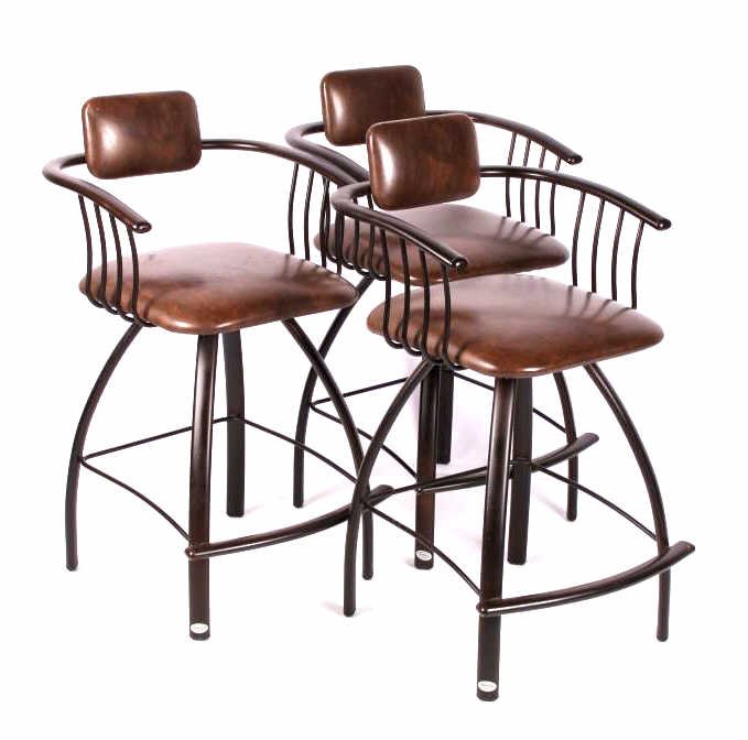 This is a set of three gibo creations leather and metal swivel bar stools.