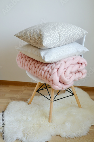 Giant Pink Blanket Woolen Knitted On White Wooden Stool Chair