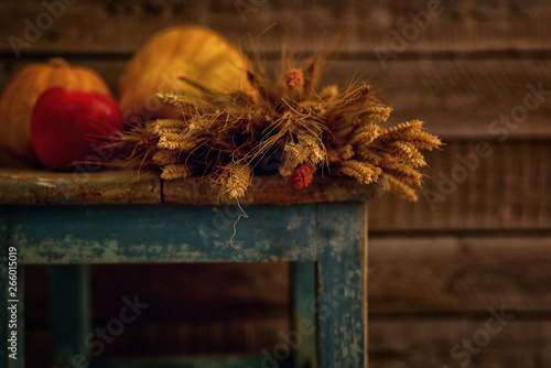 Ears Of Golden Wheat Apples And Pumpkins On Rural Weathered