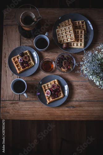 Breakfast Table Setting On The Wooden Coffee Table Waffles